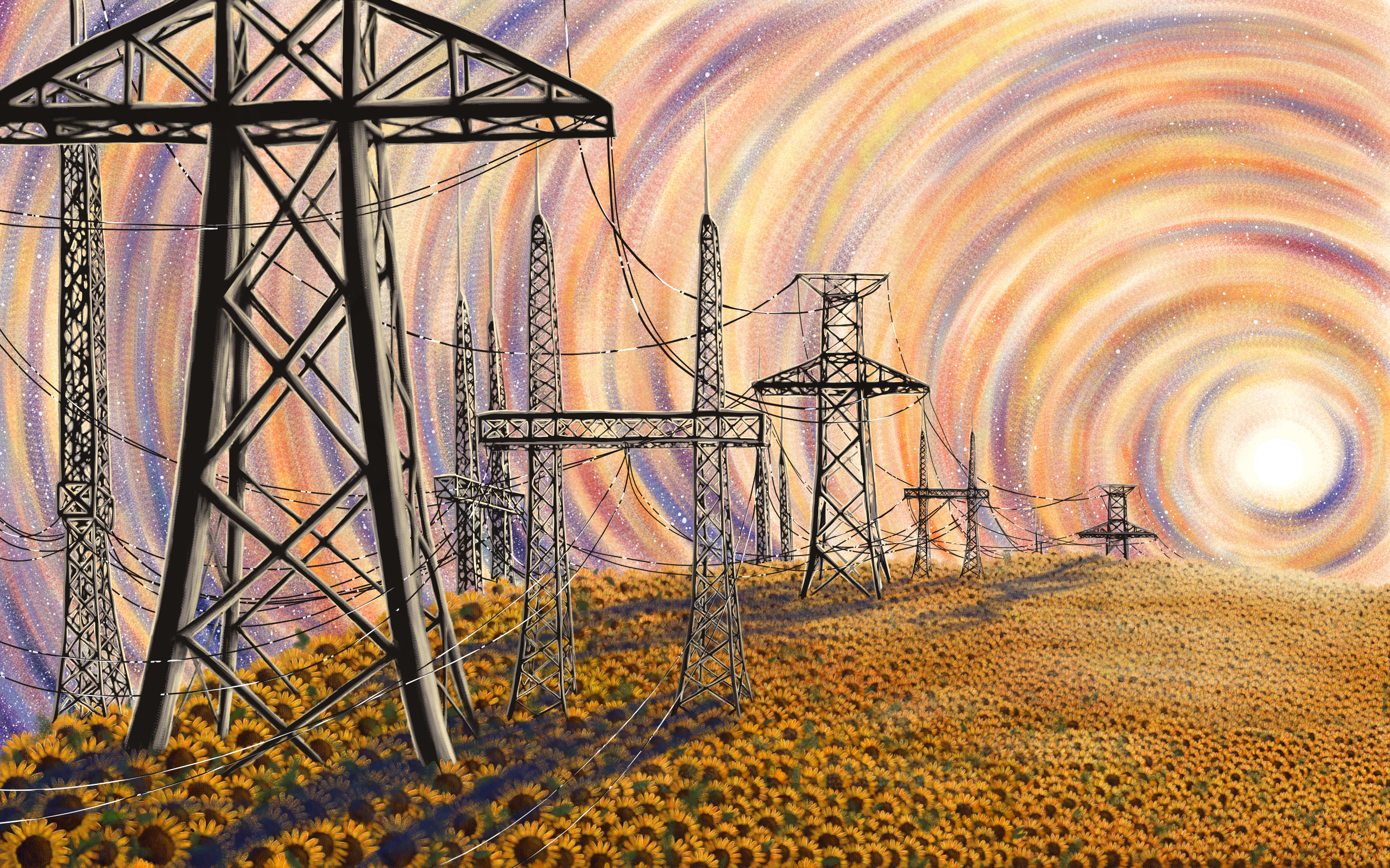 But what struck me particularly was an electrical substation positioned in the midst of a field. The harsh black lines of wire and poles and equipment somehow made the scene more, not less, beautiful.